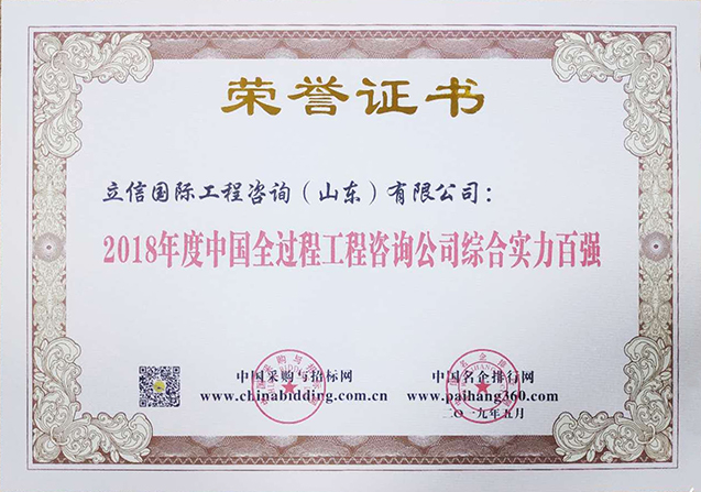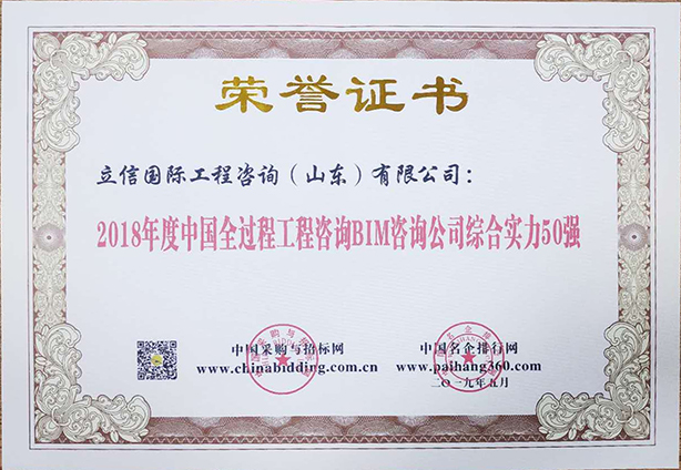 2019年5月,在“2019第13屆全國招投標領域年度聚焦暨全過程工程咨詢機構評價推介”活動中,立信國際工程咨詢(山東)有限公司獲得如下榮譽: 2018年度中國全過程工程咨詢公司綜合實力百強 2018年度中國工程造價咨詢公司綜合實力百強 2018年度中國工程項目管理公司綜合實力百強 2018年度中國全過程工程咨詢BIM咨詢公司綜合實力50強