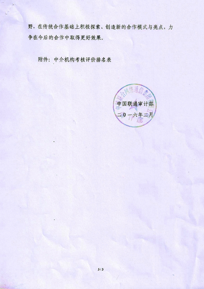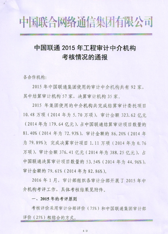 關(guān)于中國(guó)聯(lián)通2015年工程審計(jì)中介機(jī)構(gòu)考核情況的通報(bào) | |