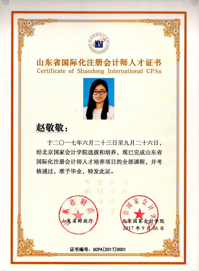 賀趙敬敬成為“山東省國(guó)際化注冊(cè)會(huì)計(jì)師人才”并獲得“優(yōu)秀學(xué)員”稱號(hào)。