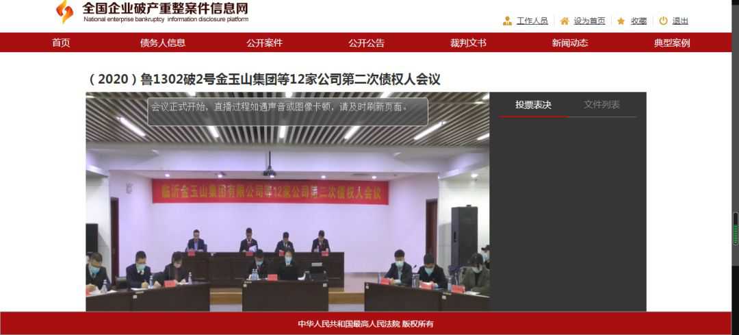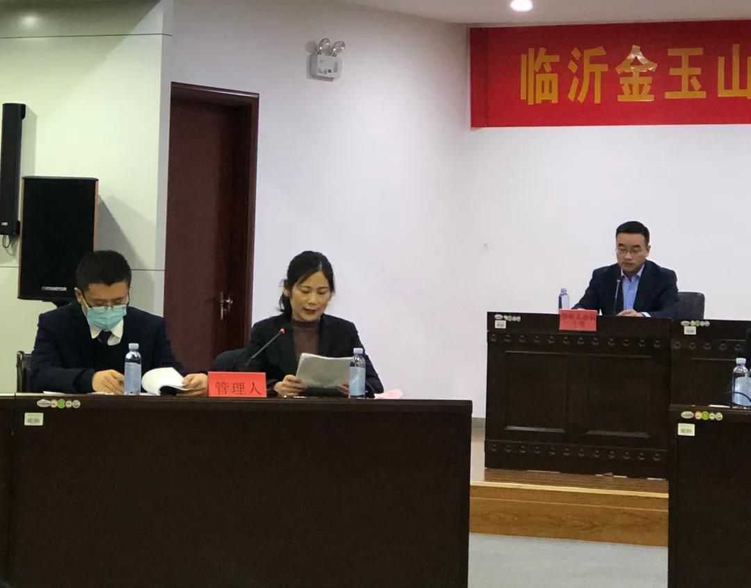 會議開始后,由臨沂市蘭山區(qū)人民法院合議庭書記員朱靜怡宣讀會場紀律,會議議程第一項:合議庭介紹案件進展情況;第二項:管理人代表尹昌鳳作《管理人履職工作報告》;第三項:審計機構代表李敏作《審計工作情況說明》;第四項:評估機構代表趙常鑫作《評估工作情況說明》;第五項:管理人代表孔鵬作《關于補充申報債權核查的報告》;第六項:管理人代表孔鵬公布《臨沂金玉山集團有限公司等十二家公司合并重整計劃(草案)》并進行介紹;第七項:管理人代表范昌龍宣讀《債權人會議表決規(guī)則》;第八項:合議庭宣讀臨時表決權決定書;第九項:山東省臨沂市沂蒙公證處宣讀第二次債權人會議線下表決結果公證情況;第十項:未表決的債權人進行線上表決并由管理人統(tǒng)計表決結果;第十一項:公布表決結果,本次會議上,全部債權組表決通過重整計劃草案。歷時一年,臨沂金玉山集團有限公司等十二家重整成功!