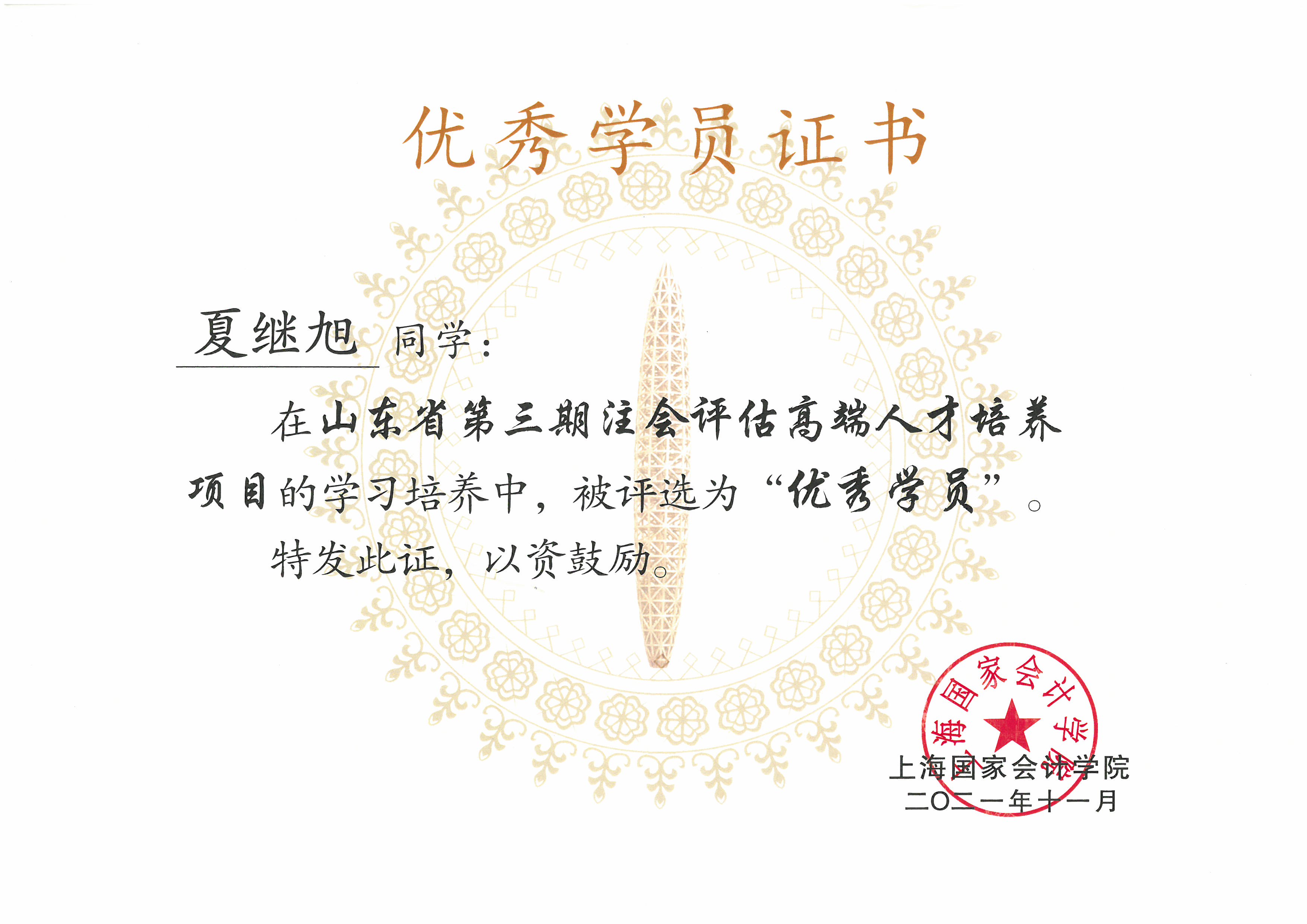 近日,山東省第三期注會(huì)評(píng)估高端人才畢業(yè)典禮在上海國家會(huì)計(jì)學(xué)院圓滿舉行。省財(cái)政廳、省注協(xié)和上海國家會(huì)計(jì)學(xué)院領(lǐng)導(dǎo)出席畢業(yè)典禮并講話,省注協(xié)秘書長梁仕念通過視頻方式對(duì)第三期高端班的學(xué)員們表示熱烈的祝賀,向全體高端人才送上美好祝愿,寄予殷切期望。 我事務(wù)所陳寶、夏繼旭、孫靜三名同志經(jīng)嚴(yán)格考核選拔為第三期高端人才培訓(xùn)人選,參加了為期三年的培訓(xùn),交出了一份出色的成績單,正式成為省高端人才,夏繼旭同志被評(píng)為優(yōu)秀學(xué)員。